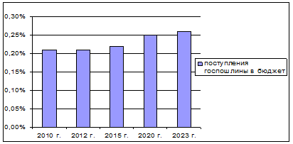 В перспективе развития РФ до 2023 г., согласно Проекту бюджетной стратегии РФ на период до 2023 года от 25.08.2008, доля налоговых платежей, поступающих в федеральный бюджет, продолжит увеличиваться. На ряду с этим будет пропорционально увеличиваться удельный вес в общем объеме налоговых доходов поступлений от государственной пошлины. Они по-прежнему будут самыми малочисленными, но как и сейчас приносить стабильный доход. Планируется проведение ряда реформ в налоговой системе, например, снижение ставки НДС с 18% до 12% и эта ставка будет единой для всех групп товаров, подлежащих налогообложению. Основными направлениями совершенствования государственной пошлины будет являться оптимизация перечня юридически значимых действий, совершаемых государственными органами, органами местного самоуправления, иными органами и (или) должностными лицами, уполномоченными в соответствии с законодательными актами Российской Федерации, законодательными актами субъектов Российской Федерации и нормативными правовыми актами органов местного самоуправления, а также индексация ставок пошлины.