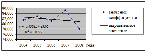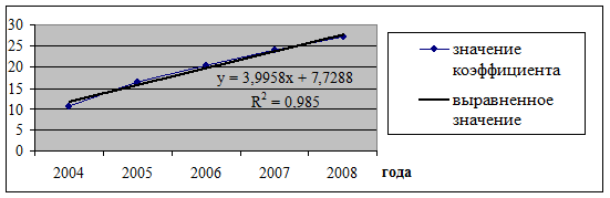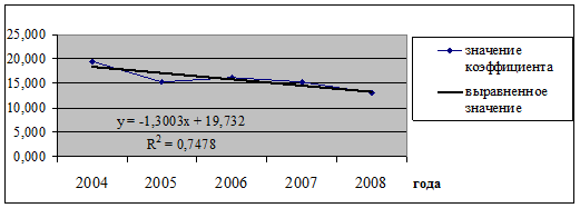 Из таблицы 10 мы видим увеличение показателя Савицкой за рассматриваемый период практически в два раза, а также то, что исследуемое нами предприятие не являлось за данный период банкротом. Более того выровненное значение показателя коэффициента, отраженное на рисунке 5 позволяет сделать вывод о платежеспособности предприятия на перспективу.