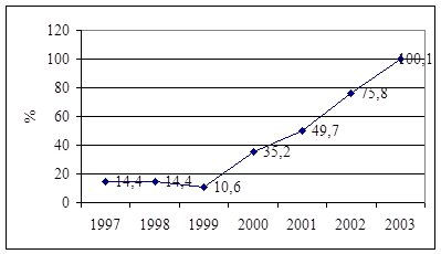 Однако, наблюдающийся почти во всех отраслях российской экономики, рост этот относительно невелик и измеряется единицами процентов. Прежде всего, такой весьма скромный рост при достаточно благоприятных общеэкономических условиях объясняется отсутствием у предприятий средств на инвестиции. Собственными ресурсами обладает лишь незначительная часть предприятий. При этом износ основных фондов в среднем по промышленности составляет более 50%, объем инвестиций за годы реформ сократился в 5 раз.