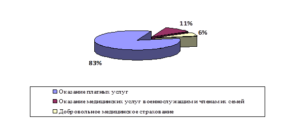 В среднем стоимость платных услуг превышает стоимость услуг по ОМС в 2,44 раз. Таким образом, окружная больница за 2009 год недополучила 1 078 877 рублей за медицинскую помощь, оказанную военнослужащим и членам их семей, что составляет 15,6% средств от осуществления предпринимательской деятельности или 0,11% всех доходов больницы.