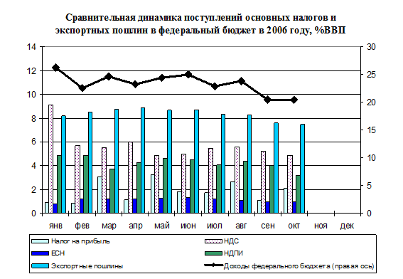 В ноябре 2006 года доходы федерального бюджета составили 21,9% ВВП, что на 0,5 п.п. ниже поступлений в ноябре 2005 года, причем сокращение произошло за счет уменьшения налоговых доходов.