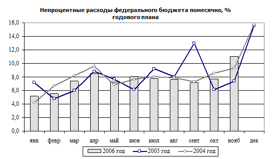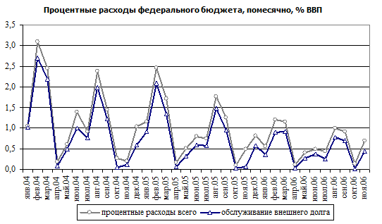 Процентные расходы федерального бюджета по итогам одиннадцати месяцев были ниже прошлогодних, что вызвано погашением в 2005 и 2006 году значительной части внешнего долга без его рефинансирования. По этой же причине график обслуживания заимствований в текущем году является более равномерным по месяцам.