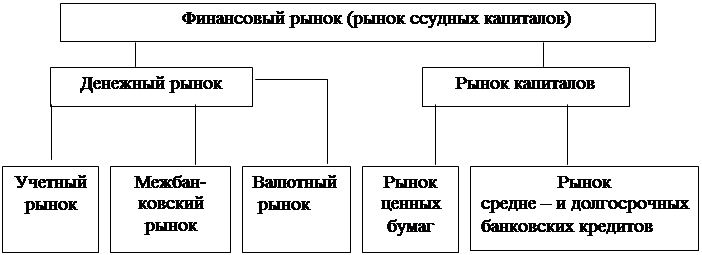 Финансовый рынок (рынок ссудных капиталов) – это механизм перераспределения капитала между кредиторами и заемщиками при помощи посредников на основе спроса и предложения на капитал. На практике представляет совокупность кредитно-финансовых институтов, направляющих поток денежных средств от собственников к заёмщикам и обратно. Главная функция финансового рынка (рынка ссудных капиталов) состоит в трансформации бездействующих денежных средств в ссудный капитал. Финансовый рынок разделяется на денежный рынок и рынок капиталов. Под денежным рынком понимается рынок краткосрочных кредитных операций (до одного года). В свою очередь денежный рынок подразделяется обычно на учетный, межбанковский и валютный рынки.