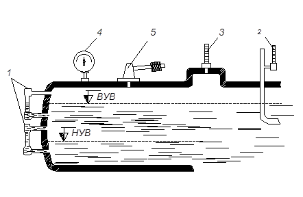 Рис. 3.3.6 Схема установки контрольно-измерительных приборов на паровом котле: ВУВ – высший уровень воды;