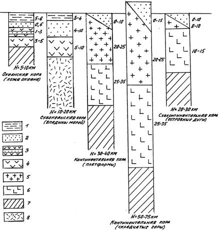 Океанская кора характерна для Мирового океана. Она отличается от континентальной по мощности и составу. Мощность ее колеблется от 5 до 12 км, составляя в среднем 6-7 км. Сверху вниз в океанской коре выделяются три слоя: верхний слой рыхлых морских осадочных пород до 1 км мощностью; средний, представленный переслаиванием базальтов, карбонатных и кремнистых пород, мощностью 1-3 км; нижний, сложенный основными породами типа габбро, часто измененными метаморфизмом до амфиболитов, и ультраосновными амфиболитами, мощность 3,5-5 км. Первые два слоя пройдены буровыми скважинами, третий охарактеризован материалом драгирования.