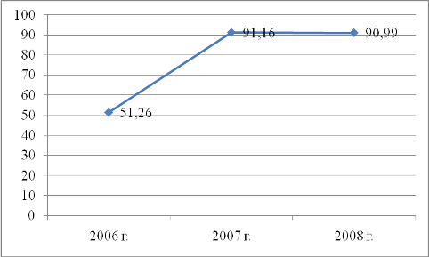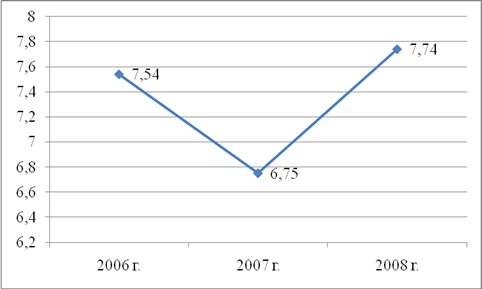 Положительная динамика коэффициента обновления в 2007 и 2008 годах свидетельствует о больших объемах поступления основных средств на баланс предприятия, что является положительной тенденцией, так как данный коэффициент характеризует достаточный уровень обновления фондов для нормальной деятельности рассматриваемого предприятия. Снижение в 2007 и 2008 годах по сравнению с 2006 годом значения коэффициента выбытия говорит о довольно большой доле выбывших основных средств в общей структуре фондов. Это связано с тем, что предприятие продало устаревшее нерентабельное или низкорентабельное оборудование, которое утратило свою актуальность при закупленном новом оборудовании. Снижение срока обновления с 2006 по 2008 годы является положительным сдвигом в структуре движения основных средств. Так, срок обновления основных фондов ООО «Тройка-ресурс» за период с 2006 по 2008 год снизился примерно на 0,24 или на 3 месяца. Коэффициент прироста показывает долю прироста основных средств в стоимости их на начало года. Данные расчетов показывают, что за рассмотренный период этот показатель увеличился с 2006 по 2008 годы с 0,59 до 0,75, что говорит о незначительном, но росте поступлений основных средств за данный период. А в 2007 году данный коэффициент составлял 0,72, что также связано с обновлением основных фондов предприятия в этом периоде. Коэффициент выбытия основных средств в 2008 году по сравнению с 2006 годом имел тенденцию к снижению с 0,10 до 0,07. Данный факт является положительным моментом в сфере управления внеоборотными активами ООО «Тройка-ресурс». При этом присутствует также такой позитивный момент как то, что коэффициент ввода увеличился с 0,43 до 0,47.