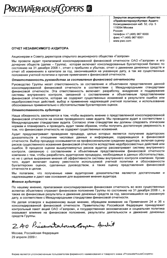 -представление плана и программы проведения аудита отчетности, в том числе на практическом примере консолидированной отчетности ОАО «Газпром» за 2008 год.