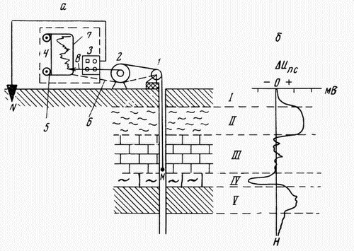 а - схема установки: 1 - блок-баланс, 2 - лебедка с коллектором, 3 - милливольтметр, 4 - регистратор, 5 - лентопротяжный механизм, соединенный гибким валиком (6) с роликом блок-баланса, 7 - диаграммная бумага, 8 - карандаш; б - диаграмма естественных потенциалов по стволу скважины: I (почва) и III (известняки) - пласты со слабой электрохимической активностью, II (суглинки) и V (глины) - пласты с положительными аномалиями ПС, IV - пласт с отрицательной аномалией ПС, характерной для проницаемых слоев