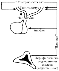 Под “короткой” цепью обратной связи понимают такое взаимодействие, когда повышение гипофизарного тропного гормона (например, АКТГ) модулирует и модифицирует секрецию и высвобождение гипофизотропного гормона (в данном случае кортиколиберина).