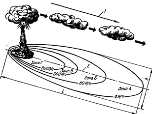 На размеры и форму радиоактивного следа оказывают влияние мощности и вид взрыва, тип грунта в районе взрыва, а также направление и скорость ветра в период выпадения РВ, атмосферные осадки на направлении перемещения радиоактивного облака, лесные массивы, рельеф местности и некоторые другие факторы.