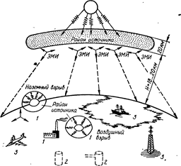 Рис. 1.9. Основные варианты ЭМ И-обстановки: 1 - ЭМИ-обстановка района источника и образования полей излучения на-земного и воздушного взрывов; 2 - подземная ЭМИ-обстановка на некотором расстоянии от взрыва вблизи поверхности; 3
