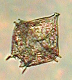 Когда наступают холода, многие динофлагелляты меняют форму, обрастают толстой стенкой, и падают на дно. Толстая стенка нужна для защиты от поедания, а гониолакс еще и окружает себя шипами. Иногда течения поднимают цисты со дна, и если оказывается, что уже стало тепло, из этой оболочки вылезает нормальная клетка водоросли и начинает свою обычную планктонную жизнь. Такой момент выхода динофлагеллят из цист мы застали в феврале 2002 года в Утрише, рядом с Анапой. Оболочка цисты - уже как тонкая пленка, она рвется, и из неё выходит молодая клетка, ее панцирь ещё не успел стать жестким.