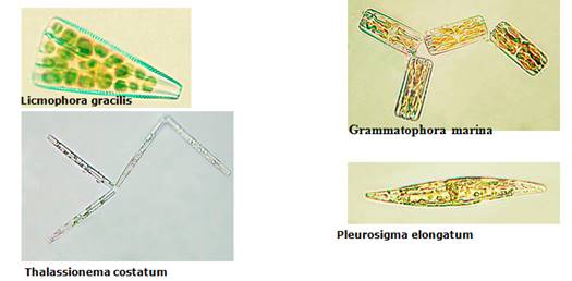 Еще несколько донных диатомей, постоянно всплывающих в прибрежный планктон: ликмофора изящная, грамматофора морская, плевросигма удлиненная и талассионема прибрежная.