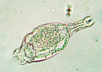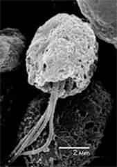 У некоторых даже образовалось нечто вроде рта и выворачивающейся наружу глотки. Этот протоперединиум Protoperidinium granii садится своими ножками на жертву, между ножек выскакивает глотка - и захватывает, затягивает более мелкую клетку, внутрь своей. Настоящий хищник.
