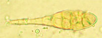 Еще одна водоросль - окрашена в буро-зелёный цвет, у нее явно нет твердого панциря, она многоклеточная. Это проросток бурой макроводоросли - из тех, что мохнатыми кустами растут на подводных камнях, возможно - это начало полутораметрового "дерева" бородатой цистозиры Cystoseira barbata - главной макроводоросли черноморского прибрежья... Пока же в ней - не более десятка клеток, она живет в планктоне, ее влекут течения и может выбросить на берег - тогда она погибнет; она может осесть на песчаное дно, не сможет закрепиться на нем, и ее съедят донные раки... Из тысяч таких проростков выживает и вырастает во взрослое растение - один.