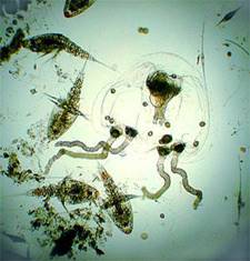 В поле микроскопа мы видим одноклеточные водоросли - фитопланктон, здесь же - поедающий их зоопланктон - мелкие рачки, гидроидные медузы, личинки рыб и беспозвоночных …