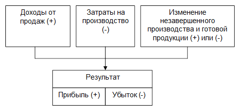 Способ определения финансового результата методом характера затрат (рис. 1.1) предполагает сопоставление выручки от продаж продукции (товаров, работ, услуг) с общей суммой затрат периода, скорректированной на изменение остатков незавершенного производства и готовой продукции.