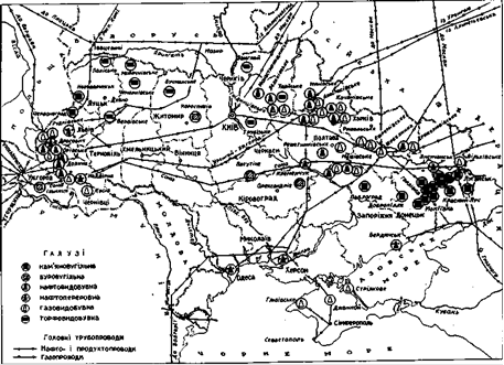 Нафтовидобувна промисловість, найдавніші спроби видобутку нафти належать до початку XVII ст. Саме тоді на Прикарпатті почали відрами витягувати "ропу", або "мазь", як її тоді називали, з природних виходів на глибині 4-6 м. Спочатку нафту використовували в натуральному вигляді як мастило, для освітлювання приміщень, як лікувальний засіб. Промислова розробка нафти почалась на базі Бориславського родовища на рубежі ХІХ-ХХ ст., із впровадженням глибоких свердловин. Родовища Прикарпаття по-хижацьки експлуатувались, що призвело до різкого скорочення видобутку нафти в цьому районі: у 1938 р. тут видобували всього 0,4 млн т. У 1950 p. v Прикарпатті було відкрите Долинське родовище нафти (Івано-Франківська обл), в 1962 р. - Бптківске, Північно-Долинське, Ольхівське та ін. Після війни домінуючу роль у видобутку нафти в Україні став відігравати Дніпровсько-Донецький район. Найбільші родовища зосереджені в Полтавській обл. (Радченківське, Зачепилівське, Новогригорівска та ін.), Сумській обл. (Качанівське, Рибальське), Чернігівській обл. (Прилуцьке та ін). На території Дніпровсько-Донецького району знаходиться найбільший центр видобутку нафти в Україні в даний час - Анастасіївське родовище біля м. Ромни в Сумській обл. (щорічний видобуток - 720 тис. т). У цьому районі і найглибша свердловина - 4928 м (Чернігівська обл., Тростянецьке родовище). У 1991 р. в Україні було видобуто 4,9 млн т нафти (у 1980 р. - 7,5 млн т). Кількість працюючих в галузі - близько 5 тис. чол. Через територію України пролягає нафтопровід "Дружба", перша черга якого почала працювати у 1962 р. У 1990 р. нафтопровід щоденно перекачував 93 тис. т нафти.
