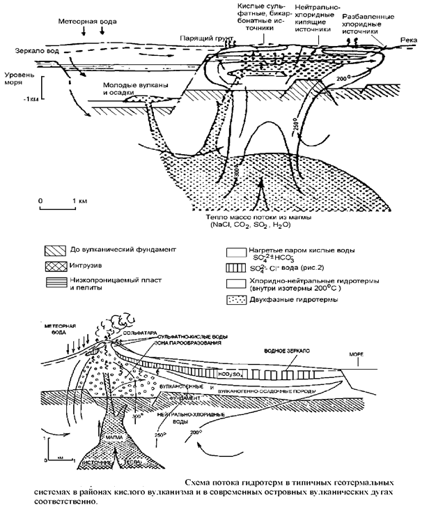 Различаются два типа систем. Первый, показанный на рис. 2.10, представляет обычную систему в условиях структур кислого вулканизма, таких как в зоне Таупо в Н. Зеландии. Основа их - это динамическая природа системы с подтоком тепла в корневые её части, конвективный восходящий поток, передача тепла к поверхности и его взаимодействие с подземными водами, подток глубинных гидротерм к поверхности Земли или его разбавление и разгрузка на некотором базисном уровне, таком как, например, как река или озеро.