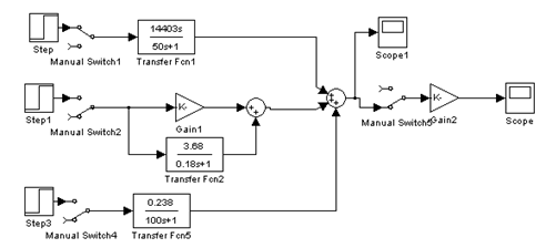 На рисунке 5 представлена структурная схема редукционной установки водяного пара, составленная по уравнению (19) с использованием типовых динамических звеньев теории автоматического управления. По этой схеме по каждому входному сигналу (каналу) можно определить передаточную функцию.