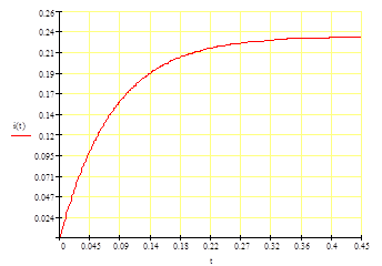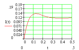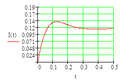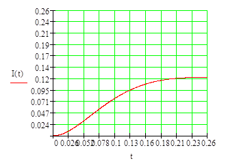 Используя обратное преобразования Лапласа к уравнению для тока определим зависимость тока в катушке электромагнита от времени. Будем полагать, что напряжение, приложенное к катушке электромагнита, является ступенчатой функцией времени. Используя ЭВМ, получим: