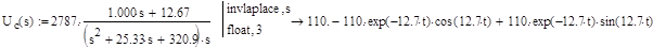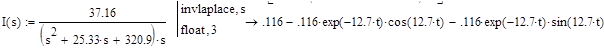 Составляем оператор. В расчётах применяется функция Mathcadidentity (2) - создаёт единичную матрицу ( по диагонали стоят единицы) размером 2*2 и операция обратная матрица (-1).Для ввода оператора поиска обратной матрицы нажмём кнопку Inverse (Обратная матрица) на панели инструментов Matrix (Матрица).Применяем функцию invlaplace для обратного перехода из комплексной области.