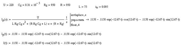 Для обеспечения апериодического переходного процесса необходимо, чтобы корни знаменателя были вещественными. Это возможно, когда: . Это уравнение решается в MACHCAD относительно С. При ( мкф ) апериодический процесс изменения тока в катушке будет оптимальным.