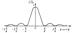 Якщо а >> b, то прямокутний отвір називають щілиною. Просторовий спектр при а ®¥ по координаті р (рис. 7, б) стискується до нуля. Тому розподіл інтенсивності в дифракційній картині від щілини може бути представлений одномірною залежністю (рис. 8):