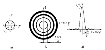 Аналогічно можна досліджувати дифракцію Фраунгофера на круглому отворі (рис. 9). У фокальній площині об'єктива (див. рис. 5, б) спостерігається центральний світлий диск, оточений концентричними світлими і темними дифракційними кільцями. Точний розподіл інтенсивності в дифракційній картині можна одержати за допомогою дифракційного інтеграла Фраунгофера (6) у полярній системі координат. Графік перетинання цього розподілу представлений на рис. 9, в. Перший мінімум освітленості (радіус першого темного кільця) спостерігається при куті дифракції, обумовленої за формулою: