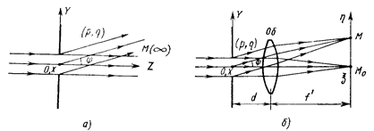 Якщо за отвором на відстані d від нього помістити високоякісний об'єктив О, то йдуть під пазними кутами рівнобіжні пучки дифрагованих променів, що будуть збиратися у відповідні точки фокальної площини об'єктива (рис. 5, б). Отже, дифракційна картина Фраунгофера з нескінченно вилученої площини переноситься у фокальну площину об'єктива; при цьому дифракційний інтеграл Фраунгофера точно описує розподіл комплексної амплітуди у фокальній площині об'єктива при його висвітленні рівнобіжним пучком променів. Введемо у фокальній площині об'єктива систему координат x, h. Дифрагований пучок з направляючими косинусами р, q фокусується об'єктивом у точку фокальної площини з координатами x»pf', h» qf', де f'- фокусна відстань об'єктива.