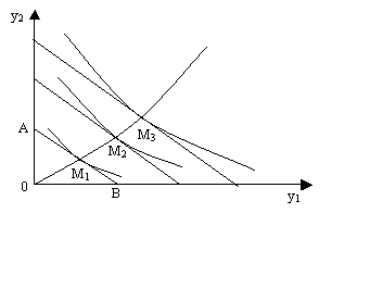 соответствуют одному и тому же размеру дохода и разным ценам на товары y1