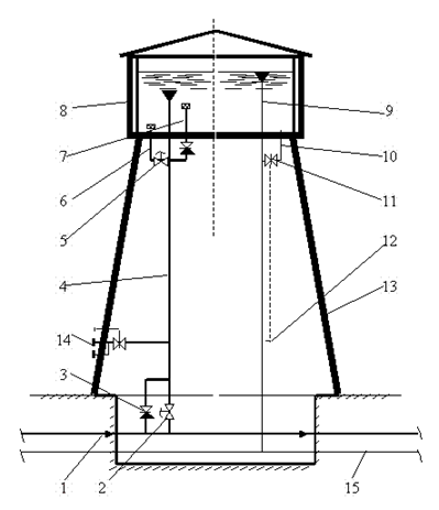 Схема водонапорной башни: 1 - водопроводная сеть; 2, 5 - электрическая задвижка; 3 - обратный клапан; 4 - подающе - отводящий трубопровод; 6 - трубопровод забора неприкосновенного запаса воды; 7 - трубопровод забора регулирующего запаса воды; 8 - шатер; 9 - переливная труба; 10 - грязевая труба; 11 - задвижка; 12 - руль управления задвижкой; 13 - ствол башни; 14 - патрубки для присоединения пожарной техники; 15 - канализационная сеть.