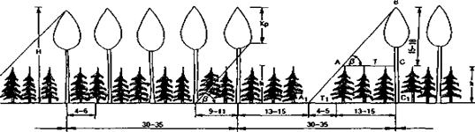 Рис. 44. Схема освещенности второго яруса ели в полдень после первого приема рубки (по Алексееву): р - высота Солнца летом в полдень (угол между направлением на Солнце в середине лета в 12 ч и плоскостью горизонта); Н(вс1)