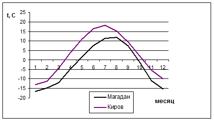 Рис. 1.1 Годовой ход температуры воздуха в Кирове и Магадане