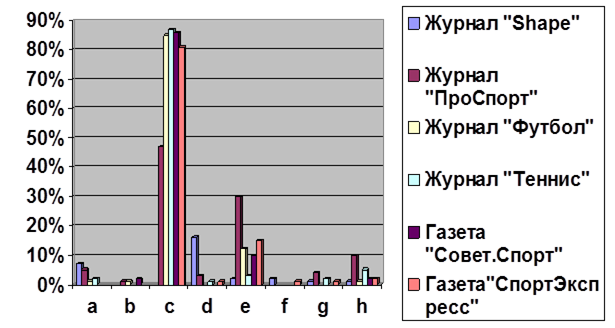 Из выше изложенных данных можно сделать вывод, что каждое спортивное издание имеет свои цели, задачи, информацию, а значит и своих читателей. Но важно отметить, что почти вся литература имеет спортивные новости, более конкретные или расширенные. Журнал «SHAPE» не имеет вообще ни каких спортивных новостей у него другая задача – публиковать больше информации о фитнесе и ЗОЖ. К сожалению, следует отметить о наличие рекламы об алкоголе в журнале «Про спорт», « Футбол» и «Советский спорт» присутствие данной рекламы вызывает отрицательные моменты и сожаление. Совсем малое количество или не было вообще информации о спортивном развлечении, досуге, активном отдыхе, ЗОЖ.