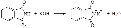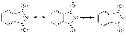 Фталимид обладает кислотными свойствами из-за делокализации отрицательного заряда имид-аниона на двух ацильных атомах кислорода Он теряет протон, связанный с азотом, при взаимодействии с основанием типа гидроксида калия. В результате этой реакции образуется фталимид-ион - анион, который стабилизируется: