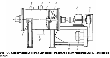 Стальной цилиндрический барабан 1 опирается на катки 7, установленные на станине 6. Внутри барабана расположена ленточная мешалка 2, состоящая из двух рядов закрученных по спирали металлических лент. Внешние ленты перемещают материал от периферии к центру, внутренние – к торцевым стенкам. Подлежащие смешению ингредиенты загружаются в барабан через люк А (или Б). Через этот же люк выгружается готовая смесь. В барабане смесителя имеется технологический люк В, который можно использовать для введения жидких ингредиентов.