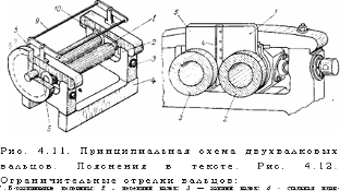 При вальцевании полимерного материала в зазоре между валками возникают распорные усилия, которые пропорциональны эффективной вязкости вальцуемого материала и могут составлять в расчете на 1 см длины валка от 3,5 до 11 кН. Для предотвращения поломки валков на концах регулирующих винтов установлены предохранительные шайбы, срезающиеся при перегрузке.