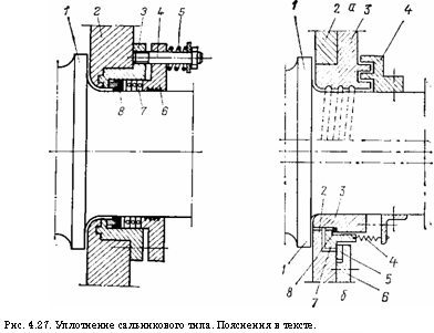 Уплотнения роторов. Для предотвращения потерь ингредиентов через зазоры между цапфами вращающихся роторов и стенками камеры в конструкции РЗС предусмотрены специальные уплотнения. Уплотнение сальникового типа (рис. 4.27) состоит из установленной на роторе 1 манжеты 8 и набора медно-графитовых колец 7, размещенных в стальной втулке 3, прикрепленной к боковой стенке 2. Уплотняющее усилие создается грундбуксой 6, на которую нажимают пружины 5, установленные по окружности уплотнения на шпильках 4. Для уменьшения трения в зазоры между кольцами нагнетается смазка.