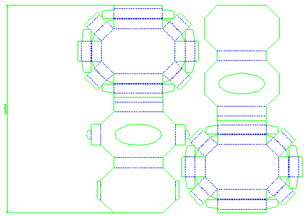 Важно разместить режущие ножи в области овала фаской внутрь, в сторону удаляемой части материала, используя ножи с односторонней заточкой, так как они позволяют более точно высекать сложный контур коробки. Для всех остальных контуров целесообразнее использовать ножи с двусторонней заточкой с прямолинейной фаской из-за более высоких эксплуатационных характеристик по сравнению с более дешевыми ножами с односторонней заточкой. Толщина ножей для картона m=305 г/квм составляет 0,71 мм, высота 23,8 мм.