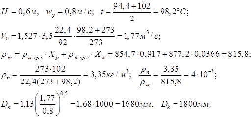 Расчёт ректификационной колонны сводится к определению основных геометрических размеров - диаметра и высоты. Обе эти величины определяются нагрузкой по пару и жидкости, типом контактного устройства, физическими свойствами взаимодействующих фаз.