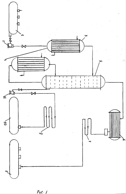 , которая получается в дефлегматоре 6 путём конденсации пара, выходящего из колонны. Часть конденсата выходит из дефлегматора в виде готового продукта разделения - дистиллятора, который охлаждается в теплообменнике 7 и направляется в промежуточную ёмкость 8. Из кубовой части колонны насосом 11 непрерывно выводится кубовая жидкость - продукт, обогащённый труднолетучим компонентом, который охлаждается в теплообменнике 9 и направляется в ёмкость 10.