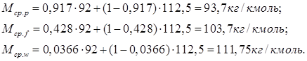 Расчёт средних молекулярных масс дистиллята, исходной смеси и кубового остатка производится по формулам: