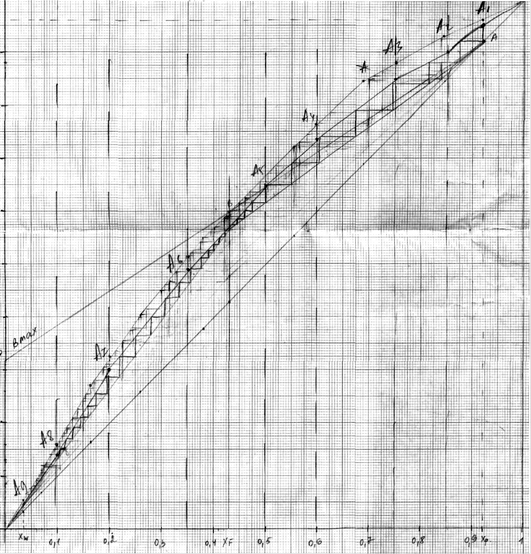 Стекая вниз по колонне, жидкость взаимодействует с поднимающимся вверх паром, который образуется при кипении кубовой жидкости в кипятильнике 4. Начальный состав пара примерно равен составу кубового остатка Х
