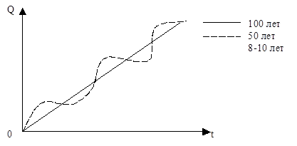 Если брать более короткие промежутки времени, то динамика развития рыночной экономики с учетом различных периодов (100, 50, 8—10 лет) может быть представлена другим, более точным графиком рис. 3).