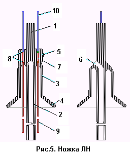 Электроды и держатели являются частью ножки. Ножка - стеклянный конструктивный узел лампы который кроме электродов включает в себя стеклянный цельной или пустотелый штабик (5) с линзочкой (4), стеклянный пустотелый штенгель (8) и стеклянную трубку тарелку (9) имеющую в нижней части развертку. Эти детали соединены между собой путем сплавления стеклянных элементов в зоне лопатки (6). Ножкой служит опорой для ТН и вместе с колбой обеспечивает герметичность лампы. Для удобства эксплуатации на горловину с помощью мастики укрепляется цоколь (11).