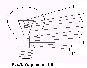 Лампы накаливания (ЛН) принадлежат к искусственным источникам света теплового излучения. Устройство ЛН основано на использовании тепла, выделяющегося при прохождении электрического тока по проводнику с высокой температурой плавления. Нагретый током тугоплавкий проводник излучает энергию, которая в форме электромагнитных волн различной длины волны распространяется в окружающем пространстве. Убыль энергии в виде излучения постоянно восполняется проходящим током.
