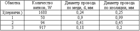 Находим диаметры проводов вторичных обмоток. Для этого составляем таблицу намоточных данных, где диаметры проводов по меди выбраны из ближайших больших стандартных значений, а диаметры проводов в изоляции взяты на 10% больше, чем диаметры проводов по меди, табл. 4.