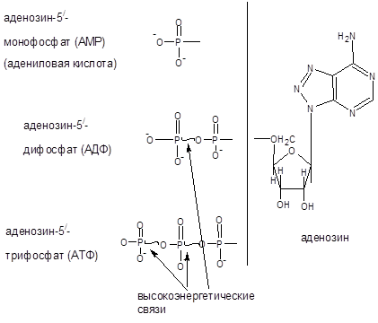Все нуклеозиддифосфаты и нуклеозидтрифосфаты содержат высокоэнергетические связи (обозначены значком «»»). При гидролизе этой связи освобождается от 30 до 50 кДж/моль энергии, в то время как при гидролизе обычной сложноэфирной фосфатной связи освобождается энергия равная 8-12 кДж/моль.