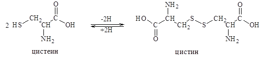 Один из примеров особенно важной модификации – окисление двух-SН–групп цистеиновых остатков с образованием аминокислоты цистина, содержащей дисульфидную связь. Так же легко происходит и обратный переход.
